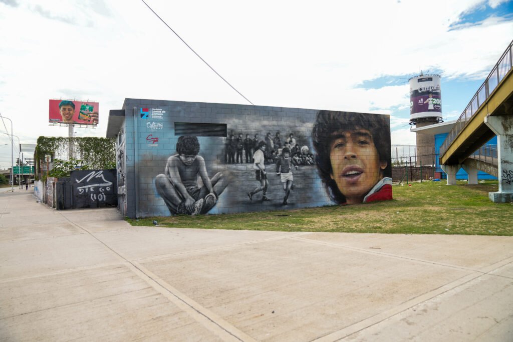 El mural está compuesto por un collage de imágenes icónicas que recorren distintas etapas de su vida. Causi recreó una línea de tiempo que comienza en el potrero de su infancia y continúa con su adolescencia, destacando sus orígenes y el camino que lo llevó a convertirse en una leyenda del fútbol mundial.