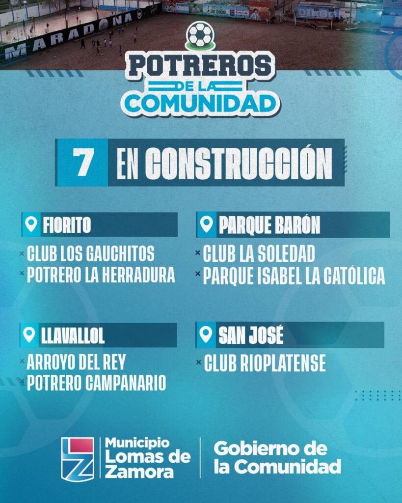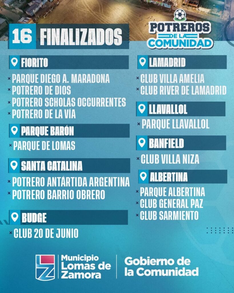 Entre las ubicaciones se encuentran el Club Villa Amelia en Lamadrid, el Parque Llavallol y el Potrero Antártida Argentina en Santa Catalina. En Fiorito entre las obras finalizadas se encuentra el potrero del Parque Diego Armando Maradona, el potrero de Dios, potrero Scholas Occurentes y Potrero de la vía. Mientras que el Potero La Herradura y del Club Los Gauchitos se encuentra en construcción.